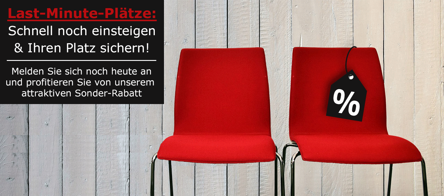 *Sonderrabatt nur für die ausgewiesenen Seminare gültig. Nicht mit anderen Rabatten kombinierbar. Ratenzahlung für die rabattierten Seminare nicht möglich. Nicht gültig für bereits gebuchte Seminare. Wir behalten uns jederzeit das Recht vor, diese Sonderaktion zu beenden.
